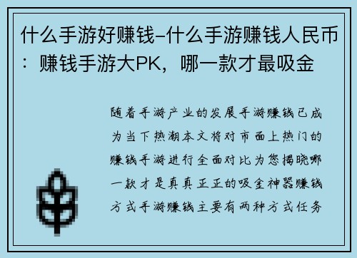 随着手游产业的发展,手游赚钱已成为当下热潮。本文将对市面上热门的赚钱手游进行全面对比,为您揭晓哪一款才是真真正正的吸金神器。